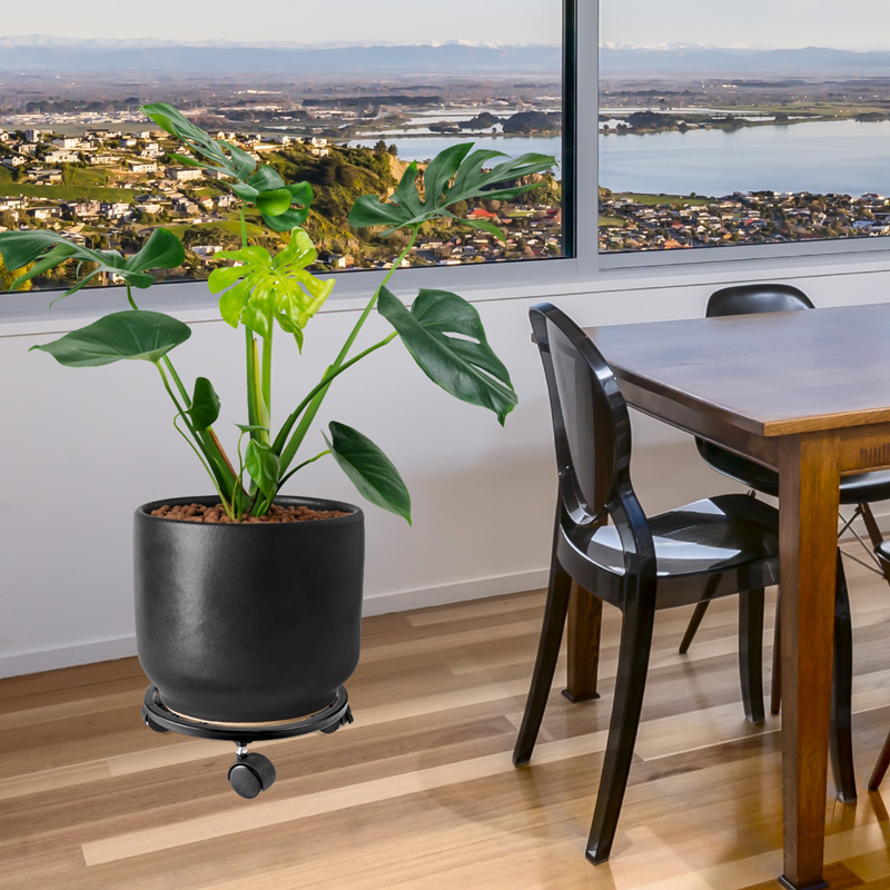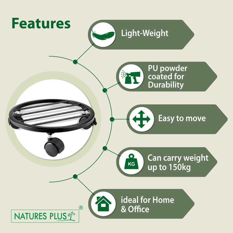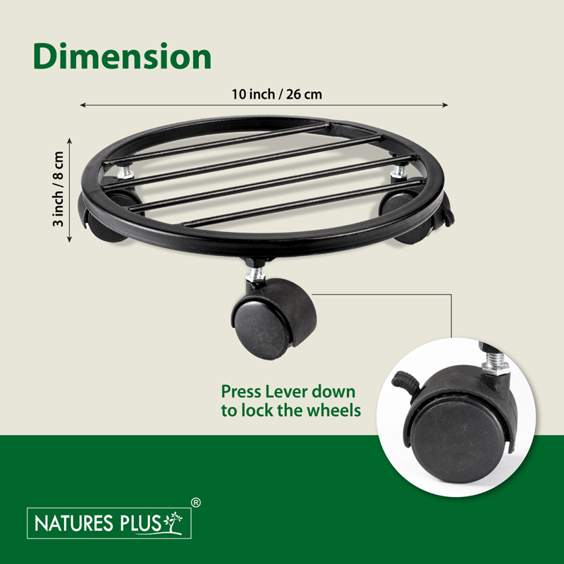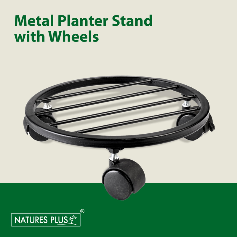 The Metal Planter Stand with Wheels is a movable stand designed to hold plant pots. Its sturdy metal frame and built-in wheels make it easy to move plants around, adding convenience and flexibility to your gardening.