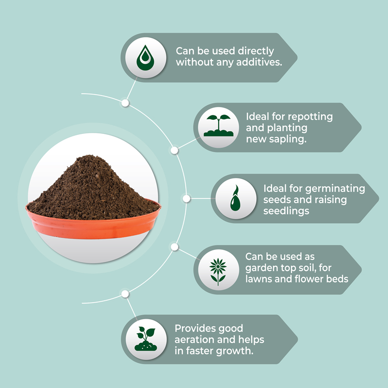 Ready to use potting media, made from a blend of red soil, coco-peat, organic manure and vermicompost. Idea for all types of plant (Indoor and Outdoor plants). Made from 100% natural ingredients. Suitable for terrace gardening and growing organic vegetables.